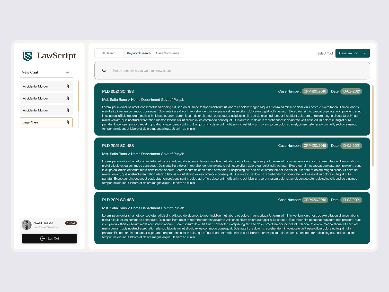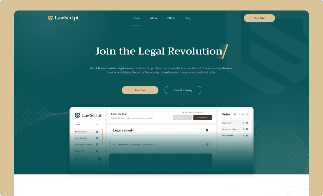 LawScript is a forward-thinking SaaS platform designed to assist law firms, law students, and legal professionals in Pakistan. The platform utilizes AI to provide accurate and reliable legal information, including case citations, case laws, and legal references. LawScript aims to revolutionize the outdated and traditional methods currently used in the Pakistani legal industry for research, legal citations, and case verification. Prior to LawScript, legal professionals faced the challenge of manually sifting through vast amounts of data on the internet to find accurate, verified legal references.